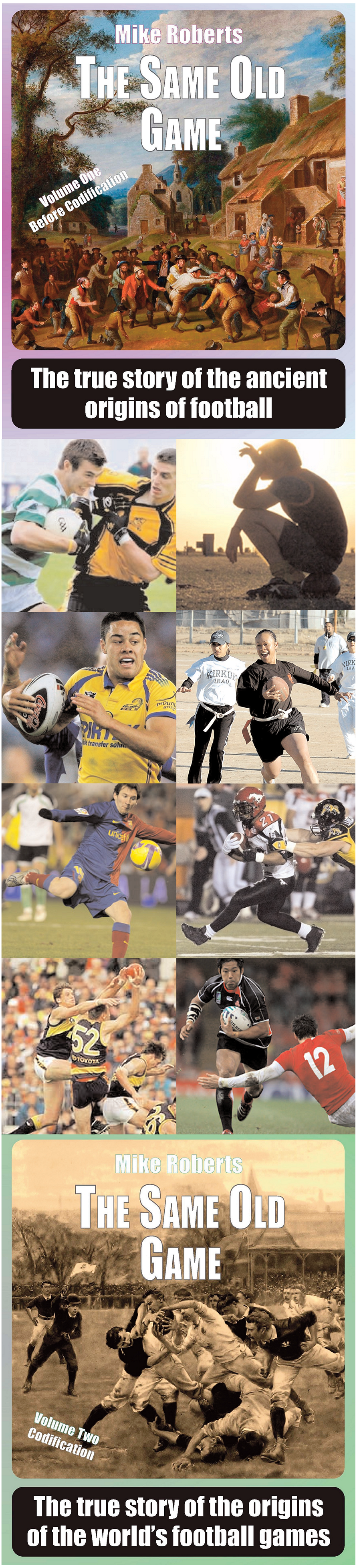 Over two volumes, the book draws on the very latest research and revisits original sources to separates fact from fiction. The first volume, The Same Old Game: Before Codification includes detailed chapters to the historic ball games of the Far East, Central America, North America, Aboriginal Australasia, Ancient Egypt, Greece and Rome, of the Vikings, of the Celts, of Medieval Italy and France and of many more different cultures, showing that the idea of kicking or throwing a ball, or even hitting one with a stick, is something that is probably older than humankind itself and that nowhere on Earth can really make a valid claim to have invented the idea.